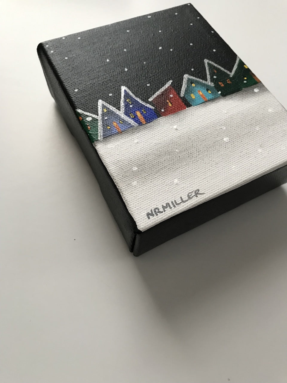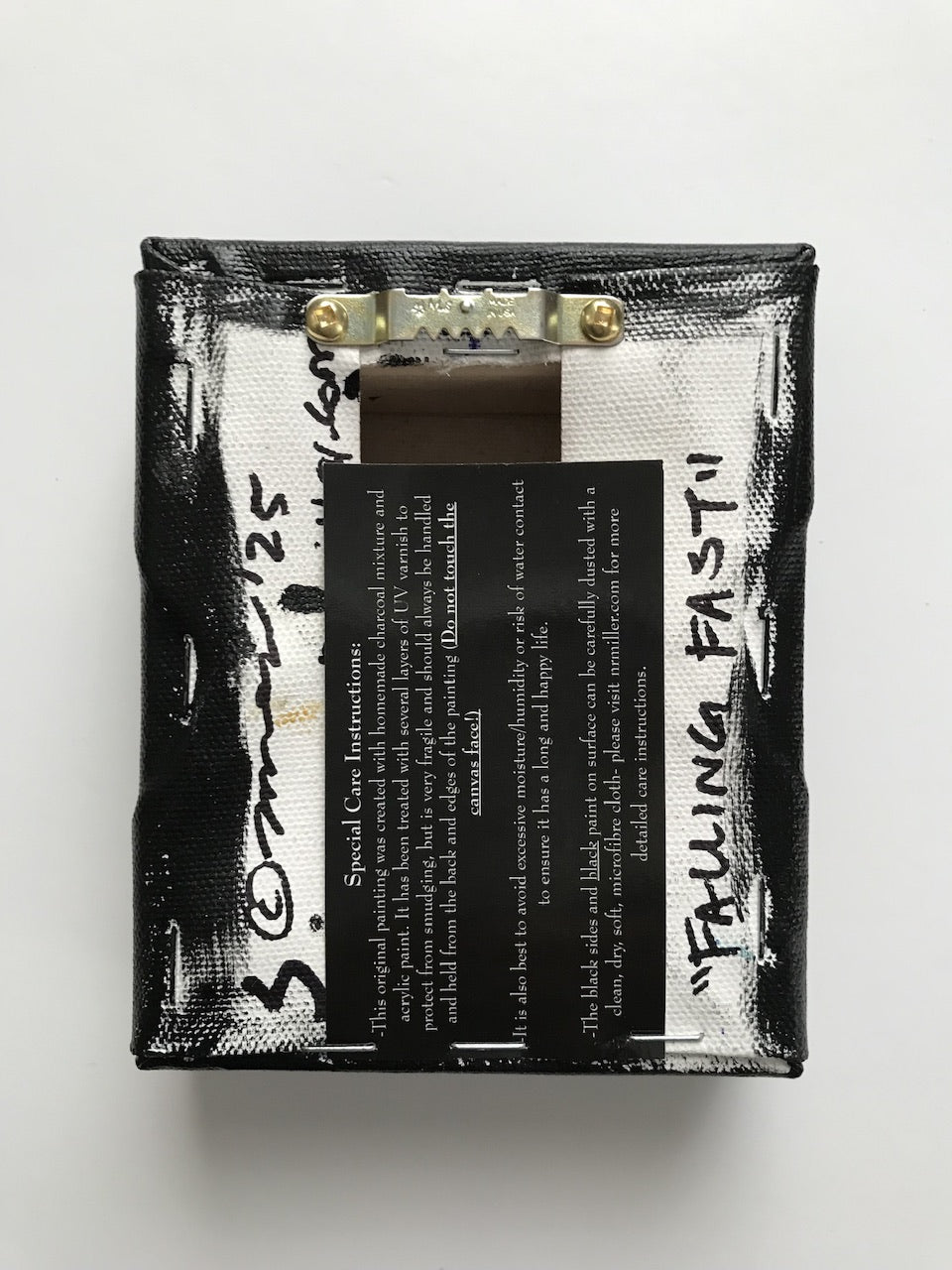 Original Painting. Mixed Media (Charcoal, soot, acrylic) on gallery wrapped canvas with sides painted black. Sealed with UV protectant varnish. Signed, named and dated on the back. Special care instructions on the back. Self levelling bar hanger- ready to hang. 5” H x 4” W x 1.75” D